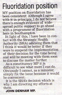 Fluoridation positionMY position on fluoridation has been consistent: Although I agree with it in principle, I do not believe there's enough evidence of widespread public support to go ahead with a programme of fluoridation here in Southampton.